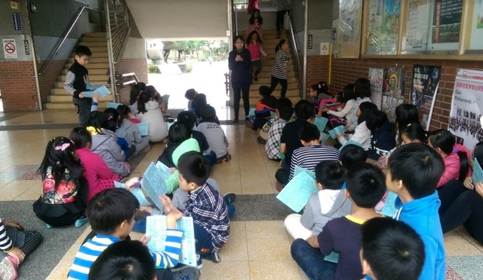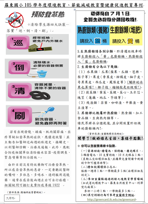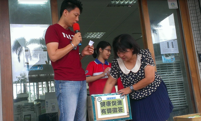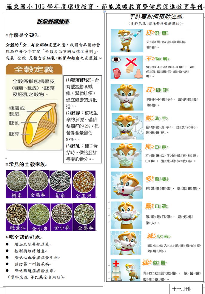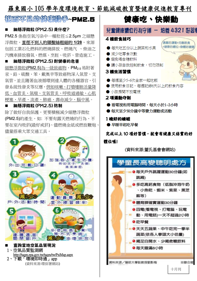 105_編製健促專刊並有效運用本校自101學年度起,每月編輯「健康促進與環境教育專刊」提供教師實施宣教活動,並舉行有獎徵答活動以達宣導之目的。定期每月編輯專刊,除提供教師運用於班級之外,亦張貼於本校佈告欄中之環保專欄中公開宣導配合專刊內容舉辦有獎徵答,寓教於樂。圖中為校長於學生朝會中公開抽出得獎小朋友。檢附105年度9、10、11月份「健康促進暨環境教育」專刊