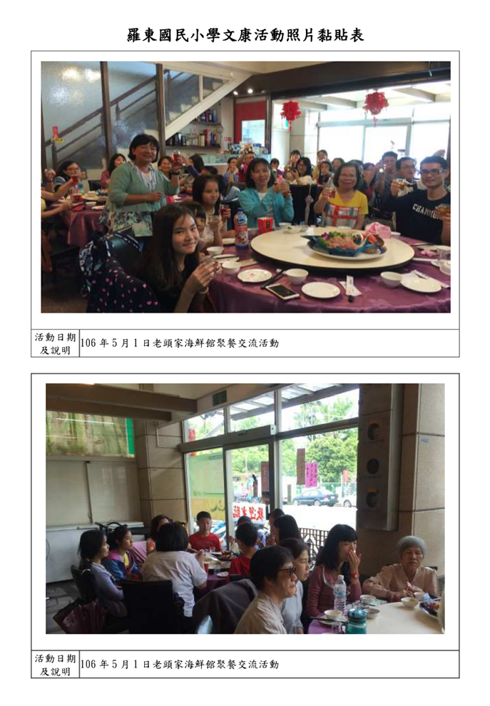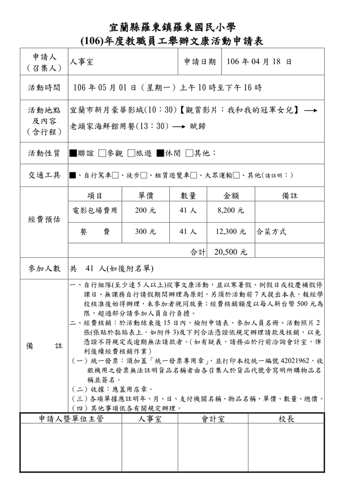 105_舉辦教職員工文康活動本校為提倡教職員工正常藝文及康樂活動,每年均會辦理文康活動,以促進教職員工情感交流。一、日期:106年4月18日二、地點:新月影城、老頭家海鮮館三、活動申請表四、人員名冊五、活動記錄