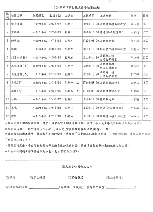 105_開辦多元社團,鼓勵學生參與促進健康活動本校為發展學生各方面身心發展,藉由開辦多元社團鼓勵學生參與促進健康,強健體魄的健康娛樂活動,藉以營造羅東國小學生健康的身心與健康的生活型態,推展健康促進優質學校的學習生活。二、社團報名表三、活動紀錄藍球扯鈴足球桌球直排輪網球