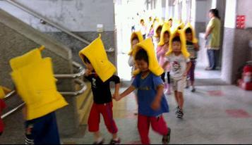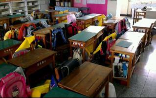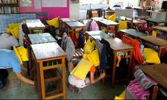學生聽到地震警報,立即戴上防災頭套、關閉電源、打開教室門以備逃生,並就近躲於桌子底下或旁邊,以雙手緊握住桌腳。 | |