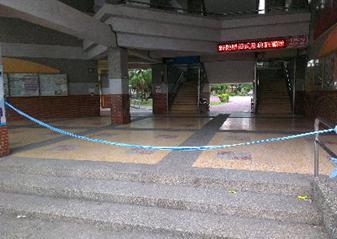 請安全防護組將危樓設置封鎖線、交通三角及錐連桿隔離,以維護學生安全。 |
