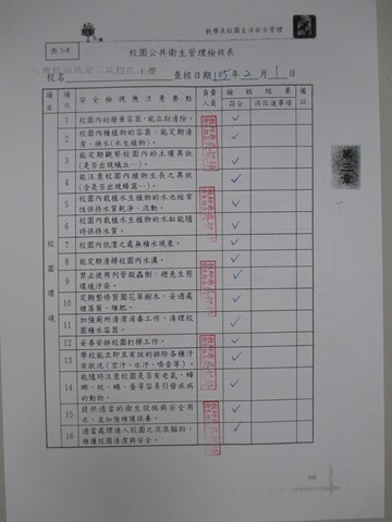 10502校園公共衛生管理檢核表Post author:吳妮錚Post published:2016 年 2 月 2 日Post category:其他配合措施 / 行政與管理 相關內容寒假年節將屆,正值流感疫情流行,請 貴校加強各項衛生教育宣導及防治措施。2015 年 1 月 27 日1-6獎勵機制(表揚、鼓勵與分享)2013 年 11 月 27 日請同仁積極落實節電措施2012 年 6 月 6 日