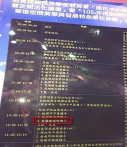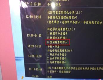 104年度環教考評─4-1 辦理或參加永續校園計畫說明或經驗分享等活動Post author:hong1220Post published:2015 年 11 月 11 日Post category:學校環教特色時間:104年11月4日參加對象:各校行政人員活動地點:桃園市中平國小活動內容:參加永續校園特色課程計畫說明及經驗分享活動。 ———————————————————————相關內容4-2-1訂定食農計畫及設置教學農場推展食農校育2020 年 11 月 19 日4-7-1小校長環保服務隊並參與環教服務工作2020 年 11 月 19 日4-3-2曾獲永續校園計畫補助持續維管成效良好2018 年 11 月 5 日
