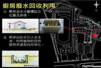 活動內容:規劃設置水循環再利用設施、對學生及參觀人員講解水循環再利用設施及校園規畫綠建築(屋頂上方設置空氣調節窗戶以利循環空氣減少冷氣之使用)等。