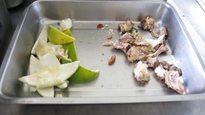 學生將吃剩的廚餘回收至廚餘桶內 | 午餐後產生的廚餘,骨頭、果皮學生會分開放置,方便廚房阿姨分類處理。 |