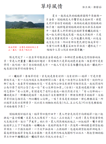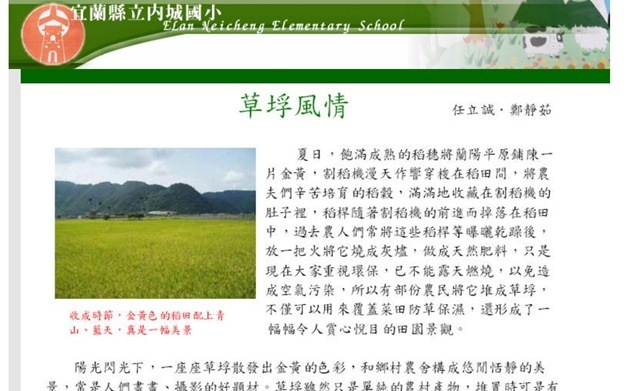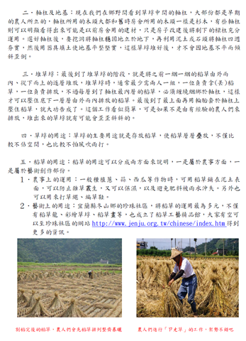 2-7 編製環境教育有關之作品–草垺風情2011 年 12 月 7 日jlc 為了節省資源,學校將相關的環教作品置於學校網頁草垺風情介紹草垺之製作過程、稻草生活上的運用,培養孩子資源利用、愛物惜福的觀念