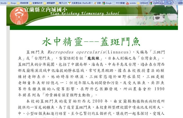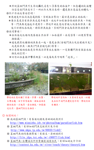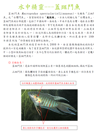 2-7 編製環境教育有關之作品–蓋斑鬥魚2011 年 12 月 7 日jlc 為了節省資源,學校將相關的環教作品置於學校網頁。水中精靈—蓋斑鬥魚介紹蓋斑鬥魚的生活環境、習性、特徵 等,蓋斑鬥魚因環境變遷而日益稀少,大家要更加珍惜愛護。