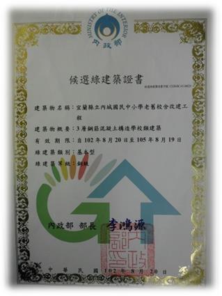 103_5-1 老舊校舍改建工程取得綠建築證書2014 年 11 月 28 日林淑真辦理主題:校舍改建工程取得綠建築證書內容說明:1. 本校老舊校舍改建工程,因應環保政策之推行,已取得內政部綠建築證書。2. 校園設備及建築以綠能為基礎,全面採用減碳、節能、省電功效之物品。 3. 校舍拆除保留原有洗手檯,供體驗教學區使用。 辦理成果:Ú 綠建築證書