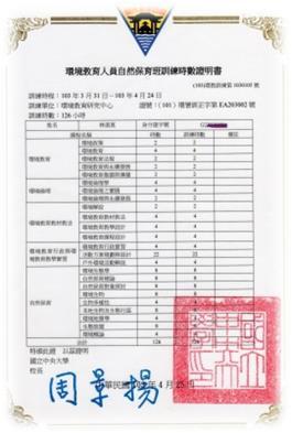103_5-6 環境教育業務承辦人已取得環境教育人員認證2014 年 11 月 28 日林淑真辦理主題:環境教育業務承辦人員,取得環境教育人員認證內容說明:環境教育業務承辦人,透過「訓練」管道取得環境教育人員 (教學及行政人員)認證。辦理成果: