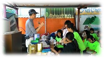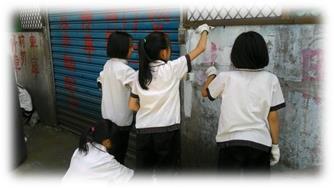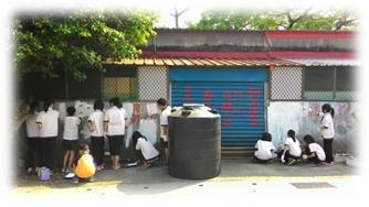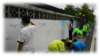 進行社區牆面彩繪,先打底,把牆面刷白。擦油漆不簡單,得抓好比例,才能調出黏稠度剛好的油漆喔!感謝張世民老師的指導,希望下週小小公民能大顯身手。敬請期待!