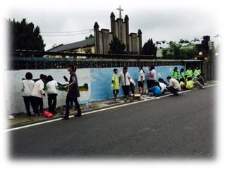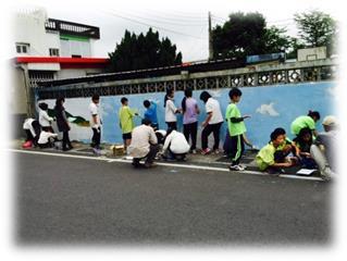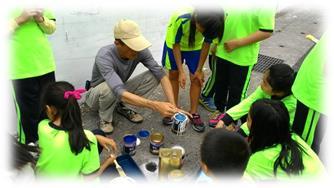 今日繼續進行社區牆面彩繪,首先要練習油漆調色、調比例,抓準圖面空間、顏色漸層……,呼!實在不容易!感謝張世民老師的指導,給小小公民體驗的機會!