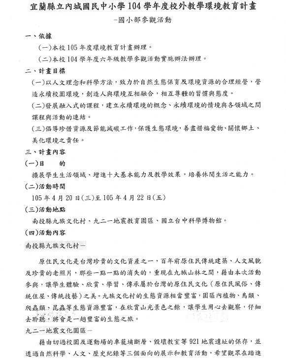 事項說明:本校105年度國小部環境教育戶外教學-於105年4月20-22日參訪南投縣九族文化村、九二一地震教育園區、國立台中科學博物館,詳如成果說明。