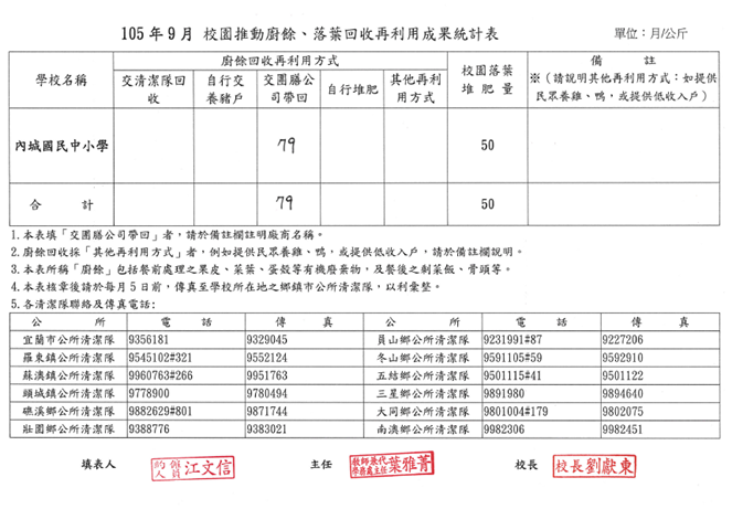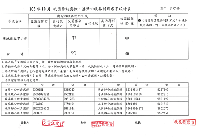 事項說明:本校廚餘定期交由團膳公司載回給養豬戶利用,並於校園內設置落葉堆肥箱,除供學校農事體驗課程及校園植栽使用外,亦可做為自然課程培育昆蟲之材料,從而減少垃圾之丟棄量,達到環境保護之功效,並按月回報回收量予員山鄉公所。