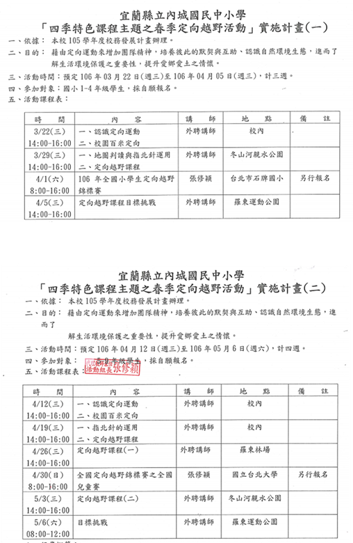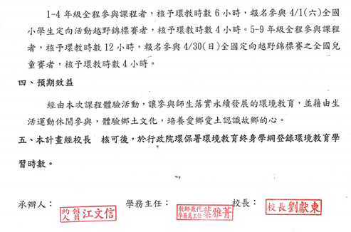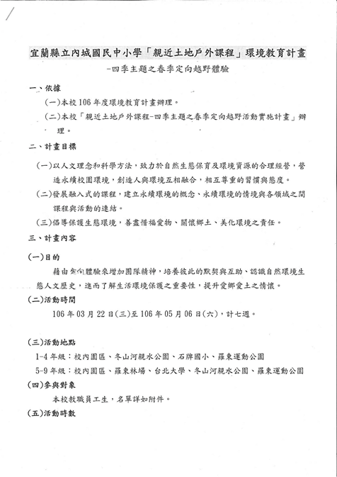106_2-1 四季主題-親近土地戶外課程-春季定向越野體驗2017 年 11 月 18 日江文信辦理事項:研討環境教育課程,研發環境教育教材、教學模組,推動環境議題行動研究,並將環境教育融入各科教學事項說明:本校105學年度辦理四季主題課程-春季定向越野體驗課程,藉由定向越野體驗來增加團隊精神,培養彼此的默契與互助、認識自然環境生態人文歷史,提升愛鄉愛土之情懷。詳如成果說明。辦理成果: 成果照片:
