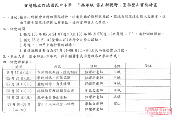 事項說明:本校105學年度辦理四季主題課程-高年級夏季山野探索課程,探訪雪山,藉由山野探索來增加團隊精神,培養彼此的默契與互助、認識自然環境生態人文歷史,進而了解生活環境保護之重要性,提升愛鄉愛土之情懷。詳如成果說明。