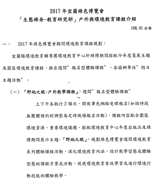 辦理事項:研討環境教育課程,研發環境教育教材、教學模組,推動環境議題行動研究,並將環境教育融入各科教學(含申請宜蘭縣環教中心課程)
