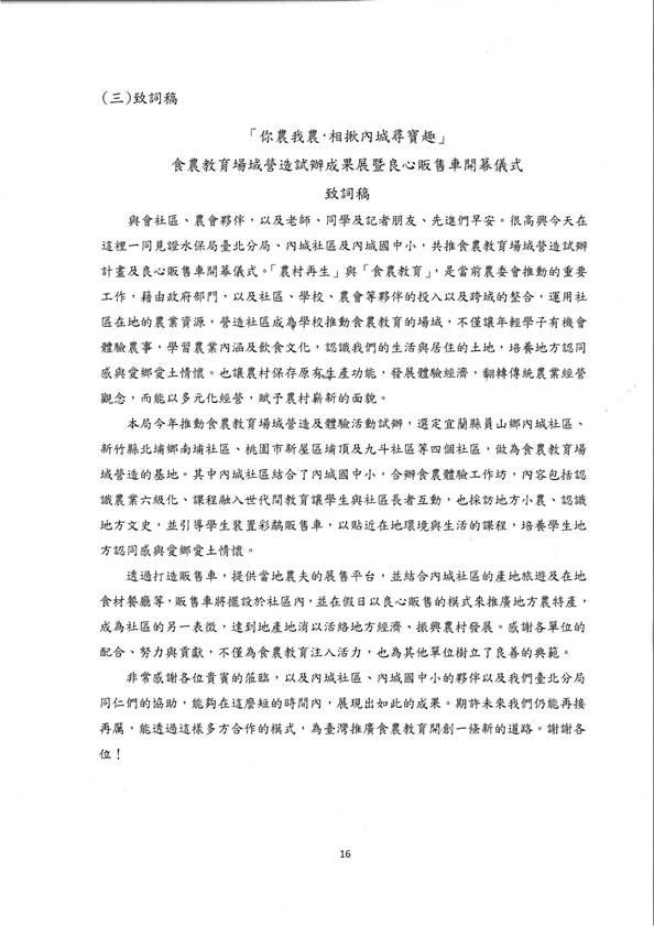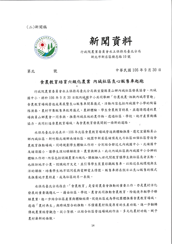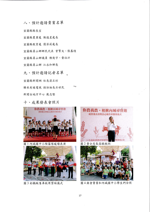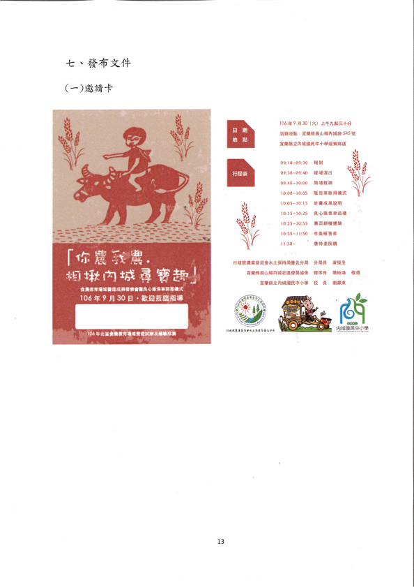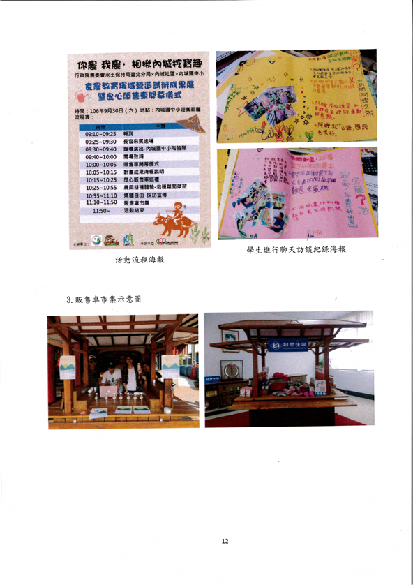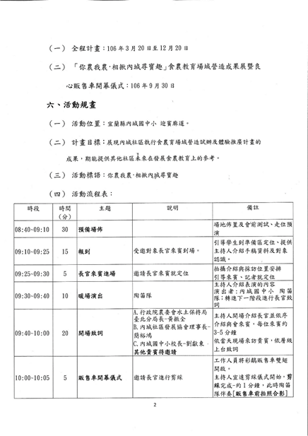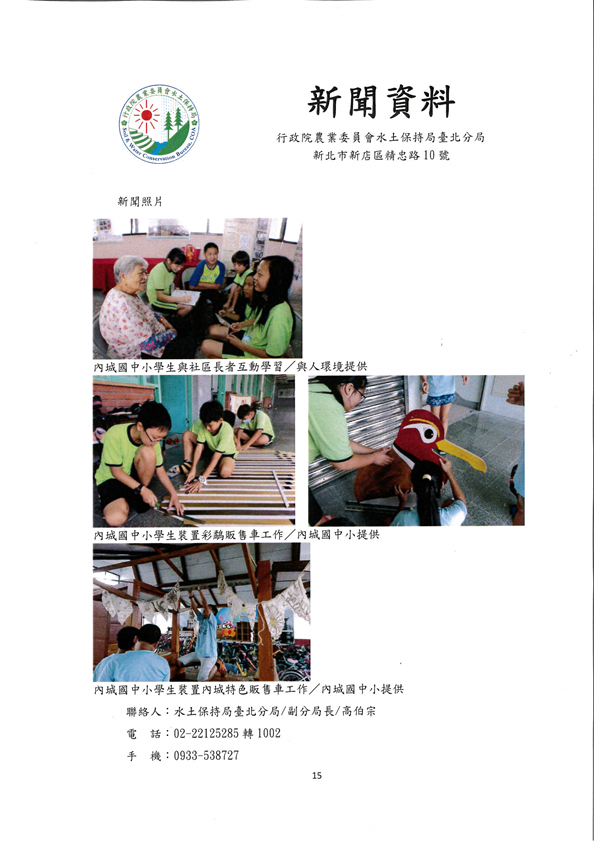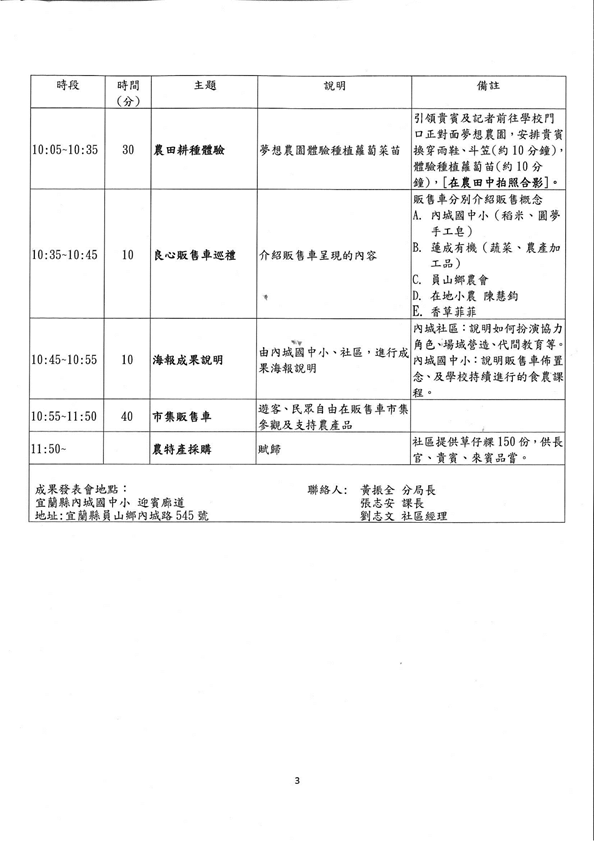 事項說明:本校與行政院農委會水土保持局台北分局、內城社區發展協會共同辦理「你農.我農.相揪內城挖寶趣-食農教育場域營造試辦成果展暨良心販售車活動」,詳如成果說明。