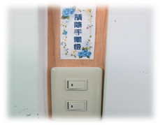 電燈開關全面加貼「請隨手關燈」字樣,提醒使用者養成好習慣。