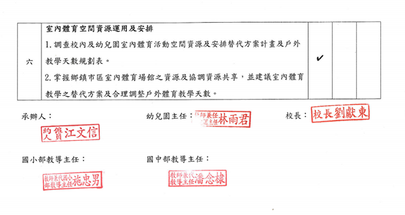 事項說明:校園空氣品質教育活動(空氣品質警示方式、專人查詢及網站連結、掌握敏感性族群學生名單、學校宣導活動、融入課程教學、室內體育空間資源運用及安排),詳如成果說明。