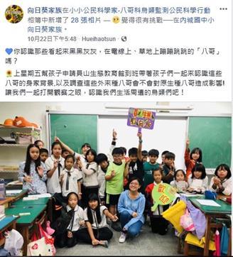 107_2-2 環境教育課程-八哥科鳥類監測公民行動2018 年 11 月 19 日江文信辦理事項:結合民間團體、地方產業和社區資源辦理環境教育活動,並有卓著之事蹟事項說明:本校與員山鄉生態教育管合作,由講師到校上課,上課主題為「八哥科鳥類監測公民行動」,詳如成果說明。辦理成果: 附件-活動成果照片 粉絲頁記錄小公民課程講師上課情形小組討論閱讀相關資料合影留念粉絲頁記錄小公民課程