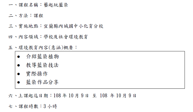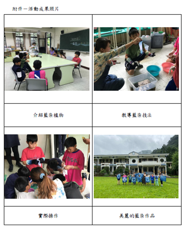 108_2-1 化育系列-課程融入環境教育-藝起來玩藍染2019 年 11 月 20 日江文信辦理事項:研討環境教育課程,研發環境教育教材、教學模組,推動環境議題行動研究,並將環境教育融入各科教學事項說明:化育分校美勞課程教學融入環境教育教學元素色彩-藝起來玩藍染,詳如成果說明辦理成果:
