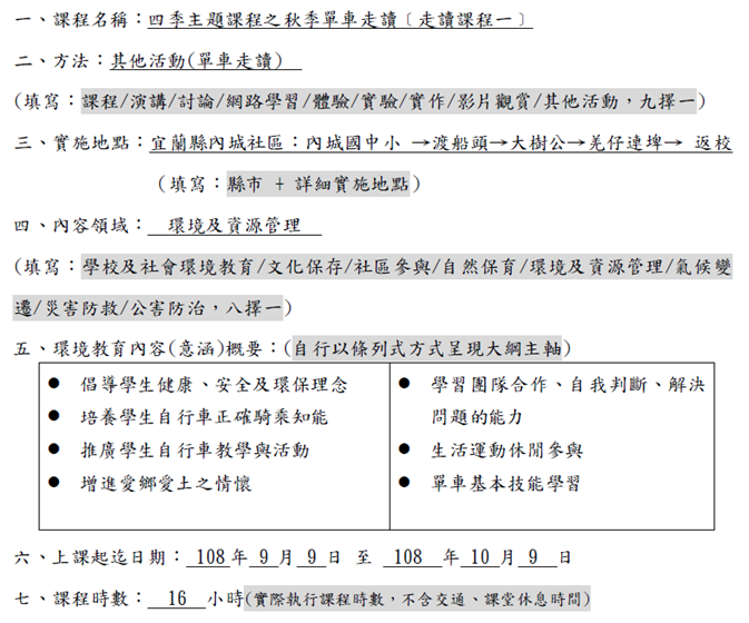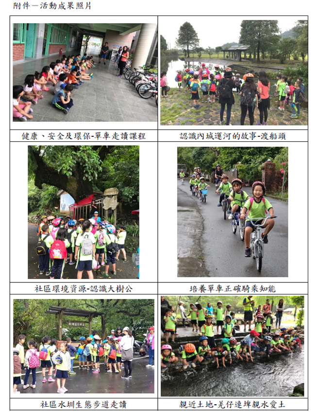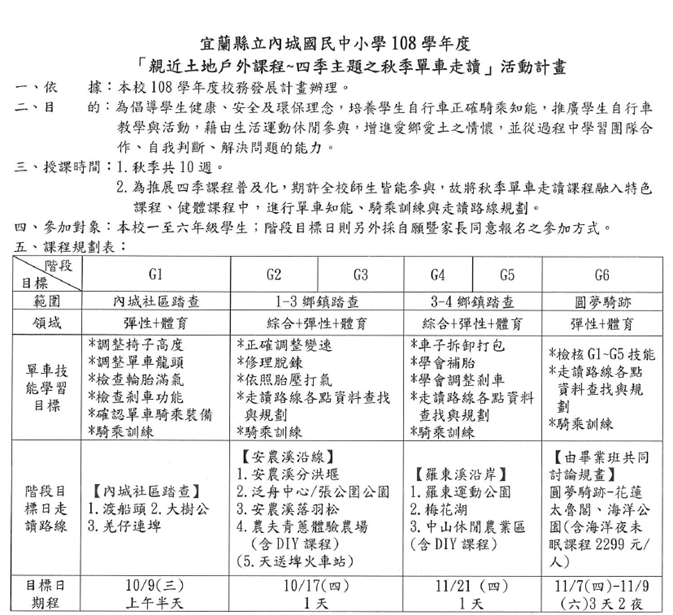 事項說明:本校108學年度辦理四季主題課程-秋季單車走讀課程-一年級,為倡導學生健康、安全及環保理念,培養學生自行車正確騎乘知能,以最環保低碳的方式,推廣學生自行車教學與活動,藉由生活運動休閒參與,體驗鄉土文化,培養愛鄉愛土認識故鄉的心,詳如成果說明。