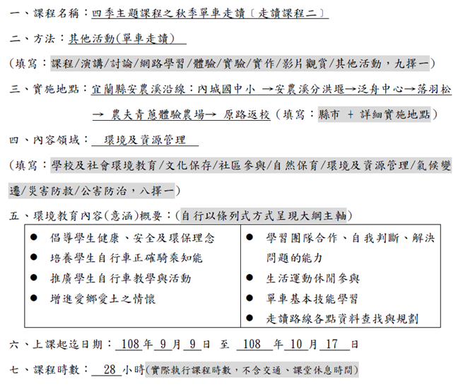 事項說明:本校108學年度辦理四季主題課程-秋季單車走讀課程-二至三年級,為倡導學生健康、安全及環保理念,培養學生自行車正確騎乘知能,以最環保低碳的方式,推廣學生自行車教學與活動,藉由生活運動休閒參與,體驗鄉土文化,培養愛鄉愛土認識故鄉的心,詳如成果說明。