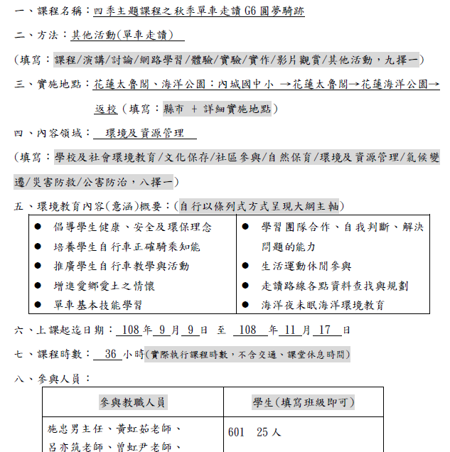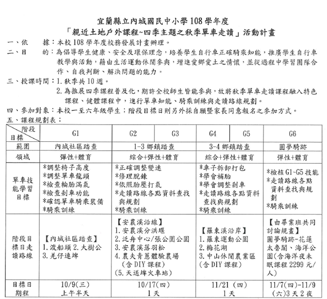 事項說明:本校108學年度辦理四季主題課程-秋季單車走讀課程-六年級,為倡導學生健康、安全及環保理念,培養學生自行車正確騎乘知能,以最環保低碳的方式,推廣學生自行車教學與活動,藉由生活運動休閒參與,體驗鄉土文化,培養愛鄉愛土認識故鄉的心,詳如成果說明。