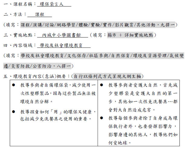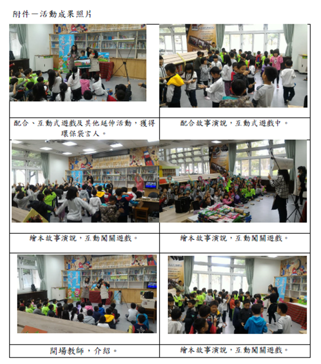 事項說明:本校參與宜蘭縣環保局「減塑宜起來,環保袋言人」環保教育推廣計畫,本計畫擬裝以各種創意式環保教具,首創互動式遊戲「環保袋言人」,搭配天然材質之手繪扇、3D背板,形成一個視覺焦點,在帶給人驚喜的同時達到推廣減塑的目的。並配合繪本故事說演、互動式遊戲及其他延伸活動,如:趣味Q&A、舊物改造玩具…等,達到宣導減塑、使用環保袋、環保愛地球的教育,詳如成果說明。