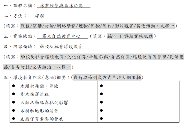 108_2-1 環境教育中心課程-林業經營與林業功能2019 年 11 月 20 日江文信辦理事項:研討環境教育課程,研發環境教育教材、教學模組,推動環境議題行動研究,並將環境教育融入各科教學事項說明:本校與林業文化園區羅東自然教育中心合作,由環教中心講師講述課程,並實際動手操作,本次研議課程主題為「林業經營與林業功能」,詳如成果說明。辦理成果: