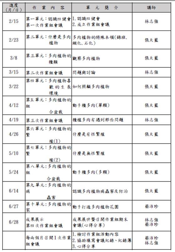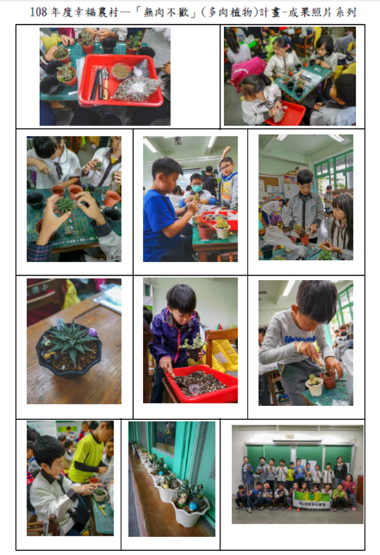 事項說明:本校有機小農夫課程,本校107學年度中年級有機小農夫課程-無肉不歡與員山鄉農會四健會合作,課程內容包括:什麼是多肉植物?多肉植物的種類、多肉植物喜歡的生長環境、如何照顧多肉植物、如何判斷健康的多肉植物、多肉植物的組合盆栽、多肉的繁殖、多肉的病蟲害,詳如成果說明。