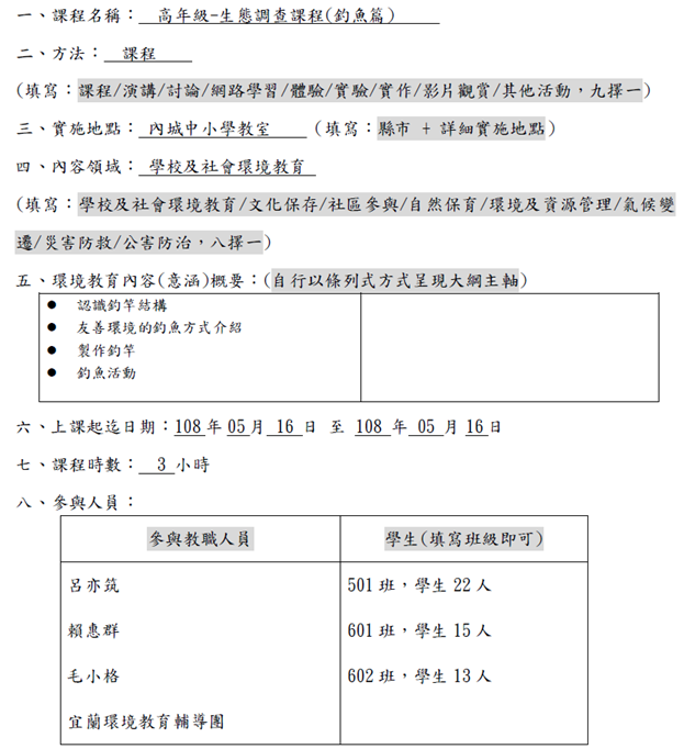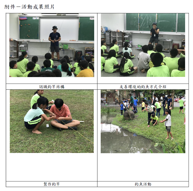108_2-2 環境教育課程-生態調查課程-釣魚2019 年 11 月 20 日江文信辦理事項:結合民間團體、地方產業和社區資源辦理環境教育活動,並有卓著之事蹟事項說明:本校與武荖坑環教中心合作,由環教中心講師與學校教師共同研議開發課程,本次研議課程主題為「生態調查課程-釣魚」,詳如成果說明。辦理成果: