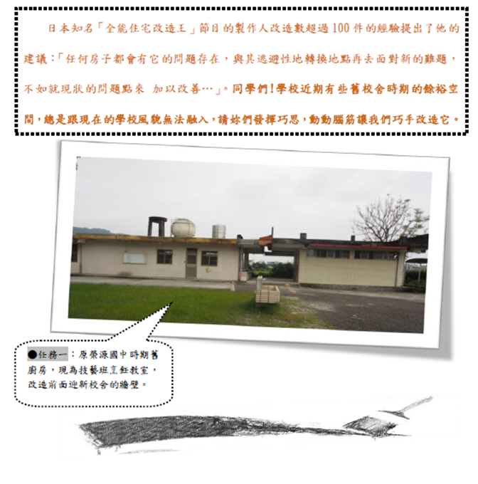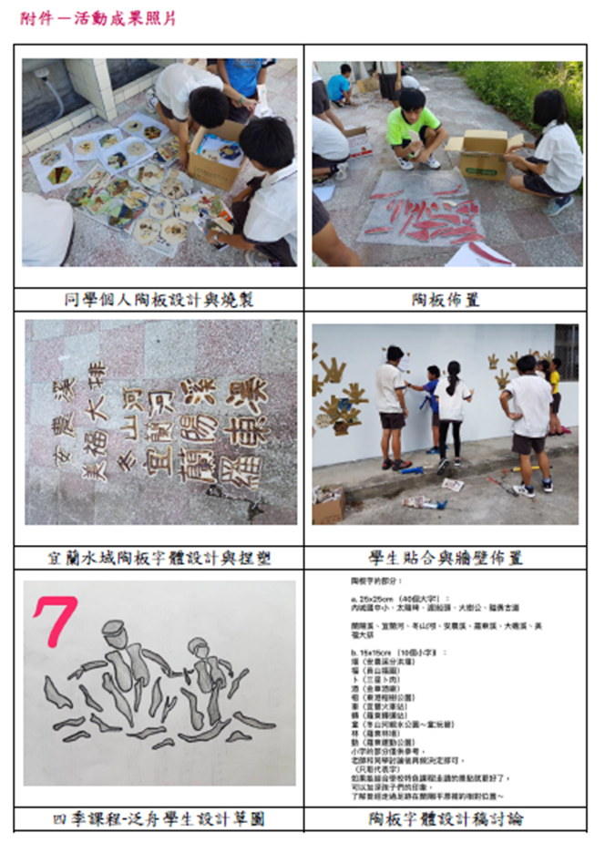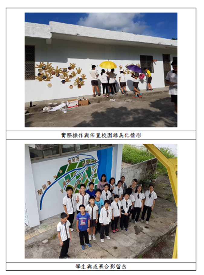 108_3-1.1校園綠美化-餘裕空間改造2019 年 11 月 20 日江文信辦理事項:校園綠美化情形一、項目:學校環境管理-餘裕空間改造美化二、要點:校園綠化美化情形-本次由校內老師帶領學生進行宜蘭水域及親近土地四季課程校園陶板彩繪佈置,將校園閒置空間做美感環境計畫設計,詳如成果說明。三、內容說明:校園變妝秀-校園餘裕空間改造計畫