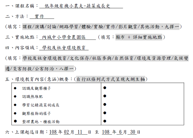 一、項目:訂定食農計畫及設置教學農場推展食農教育。