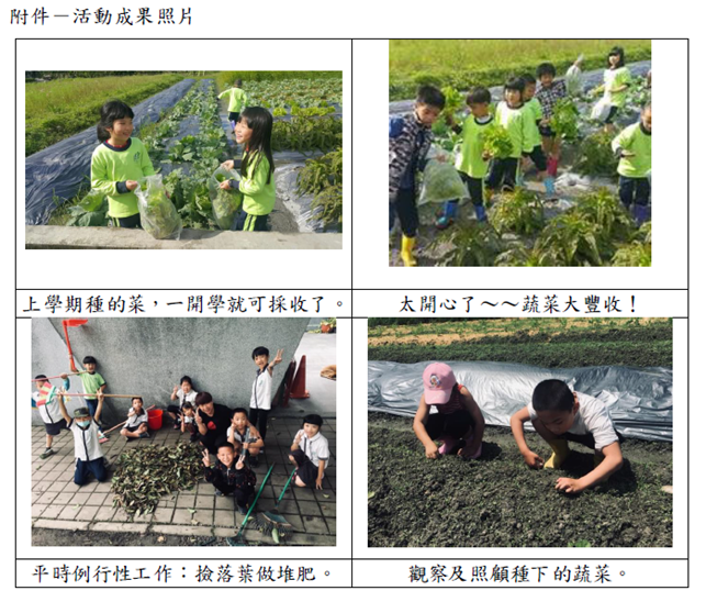 二、內容簡述:本校有機小農夫課程,每學年皆設計不同年段課程,107學年度下學期二年級有機小農夫課程-蔬菜成長史,藉由實際種植蔬菜的過程,讓學生體驗及了解農夫的辛苦,課程包括:認識當季蔬菜、觀察菜苗及蔬菜種子、認識土壤、學習友愛環境的方式、種植活動及持續照顧等,詳如成果說明。