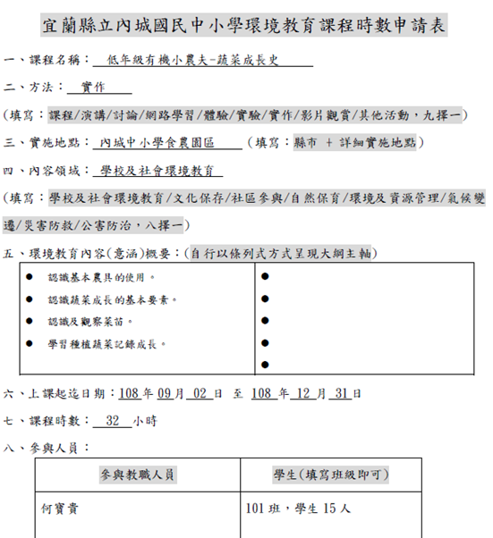 一、項目:訂定食農計畫及設置教學農場推展食農教育。
