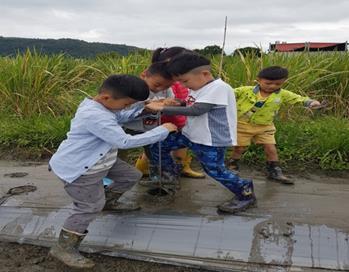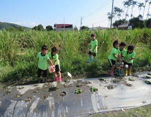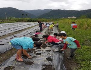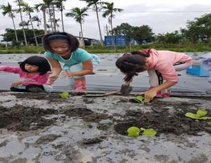 學生們下田使用農具鑽出每個菜洞。  | 學生們正在小心翼翼的將菜苗種下。  |
