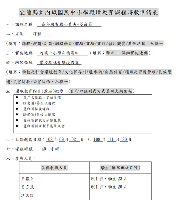 二、內容簡述:本校有機小農夫課程,與各單位合作進行戶外課程,本次108學年度上學期與員山鄉農會-四健會合作,延續上學期課程,課程內容包括追肥與水位管理、茭白筍採收課程、茭白筍料理DIY成果大會…等,詳如成果說明。