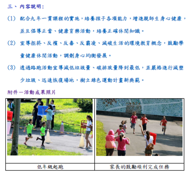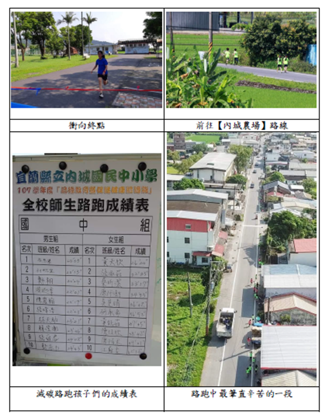 108_4-5體育季-春季減碳路跑2019 年 11 月 20 日江文信宜蘭縣立內城國民中小學108年度推動環境教育特色及創新成果報告一、項目:體育季–減碳路跑二、要點:其他學校環境教育特色及創新作為項目,辦理節能減碳相關措施活動。三、內容說明: