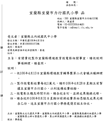 獲縣府補助拍攝環境教育微電影,如來函公文。 |