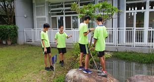 在校園空間群找適合拓印的葉脈 | 生態池旁時起掉落葉子 |