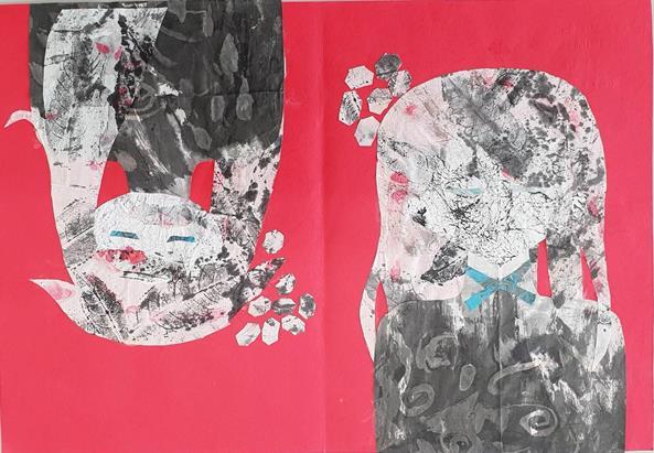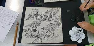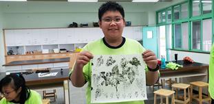 在教室課堂利用水墨塗上顏色 | 拓印在宣紙上做圖案設計 |