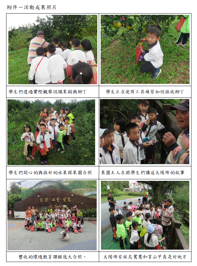 本校與太陽埤休閒農場合作,由農場主任阿石爺爺親自口述太陽埤生態故事,本次課程主題為「採果生態故事趣」,藉由社區小公民特色課程,讓孩子與土地多了連結,採果不只是獲得,而是更加懂得珍惜感恩,詳如成果說明。
