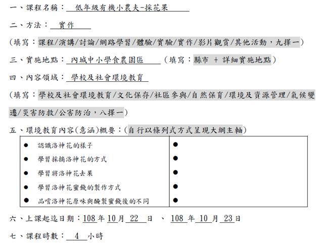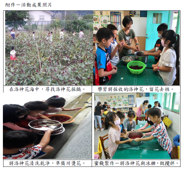 本校與內城小農合作,由農場主人親自帶領小朋友採果,本次課程主題為「洛神花之戀」,課程內容包括:認識洛神花的樣子學習採摘洛神花的方式、學習將洛神花去果、學習洛神花蜜餞的製作方式、品嚐洛神花原味與醃製蜜餞後的不同,詳如成果說明。
