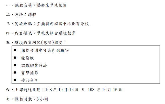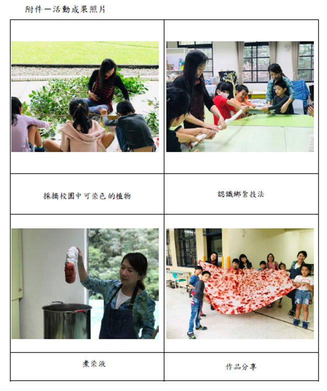 108_4-8 化育系列-校內多元系列課程融入環境教育元素-藝起來玩植物染2019 年 11 月 21 日江文信宜蘭縣立內城國民中小學108年度推動學校環境教育特色及創新成果報告一、項目:校內多元系列課程融入環境教育元素二、要點:學校其他環境教育特色及創新作為項目三、內容說明:化育分校美勞課程教學融入環境教育教學元素色彩-藝起來玩植物染,詳如成果說明。辦理成果: