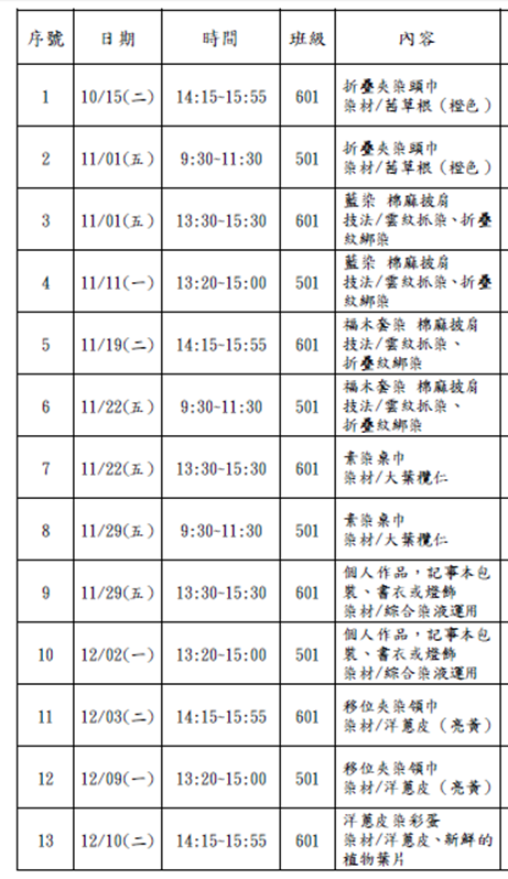 三、內容說明:本校108學年度辦理四季主題課程-冬季藝術季-染布課程,課程內容包括:(1)折疊夾染頭巾(2)藍染 棉麻披肩(3)福木套染 棉麻披肩(4)素染桌巾(5)個人作品,記事本包裝、書衣或燈飾(6)移位夾染領巾(7) 洋蔥皮染彩蛋,詳如成果說明。