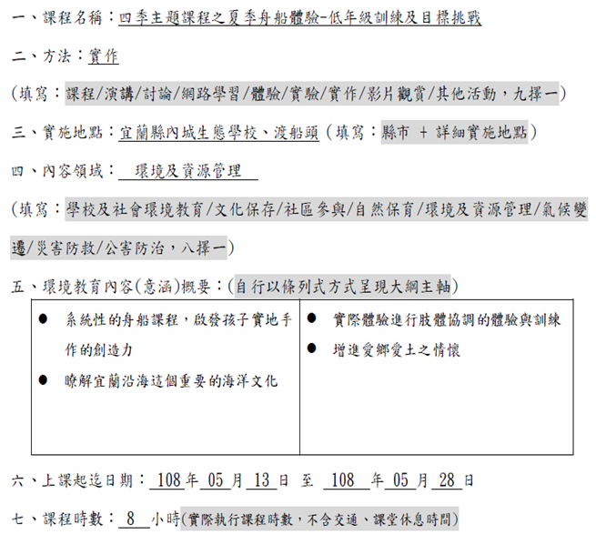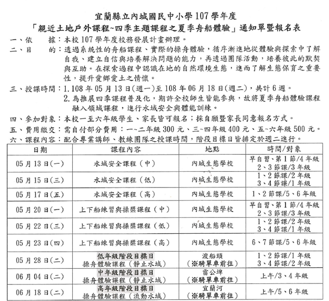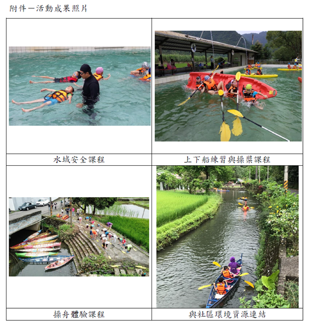 三、內容說明:本校107學年度辦理四季主題課程-低年級舟船體驗探索課程,藉由實際操舟體驗,培養自我解決問題的能力,並透過團隊活動,培養彼此的默契與互助。在探索過程中認識在地自然環境生態,進而了解生態保育復育之重要性,提升愛鄉愛土之情懷,詳如成果說明。