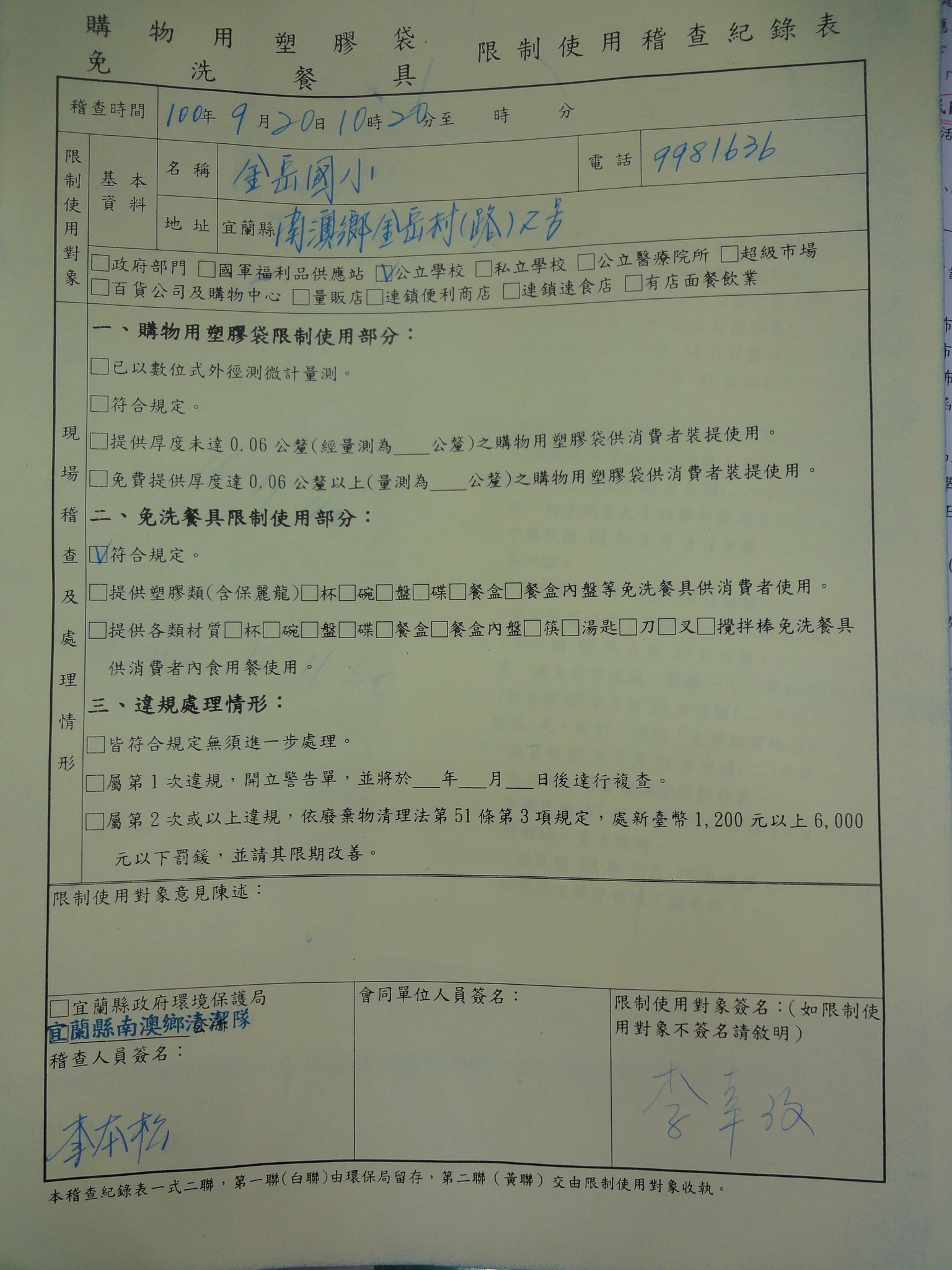 其他配合措施 校園環保實務 行政與管理 2011 年 9 月 21 日2021 年 3 月 18 日 作者: 李幸玟南澳鄉清潔隊免洗餐具稽查100.9.20主題:免洗餐具使用稽查時間:100/10/20地點:金岳國小說明:南澳鄉衛生單位到校稽查學校使用免洗餐具的情況,學校一切符合規定
