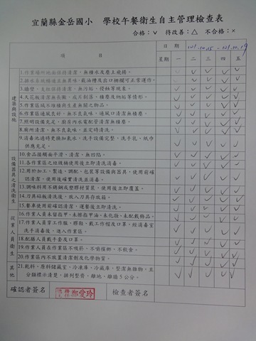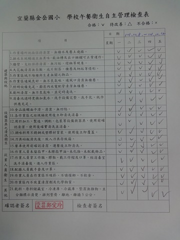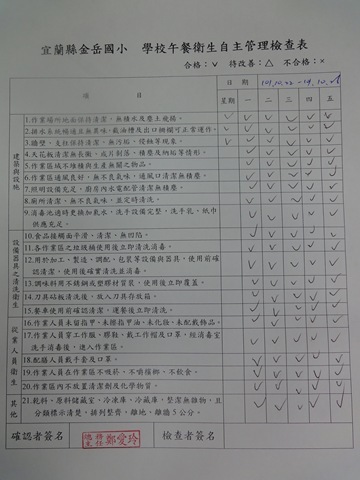 校園環保實務 2012 年 11 月 26 日2021 年 3 月 18 日 作者: 李幸玟101午餐食品衛生自行管理檢查記錄表主題:午餐食品衛生自行管理檢查記錄表說明:記錄表檢核廚房建築與設施、設備器具之清洗衛生、從業人員衛生等部分,污水處理系統暢通且無異味,符合規定。