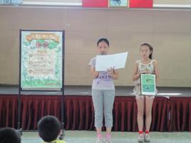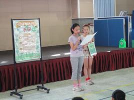 1. 環保小署長(陳憶萱)於兒童朝會上進行環保宣導